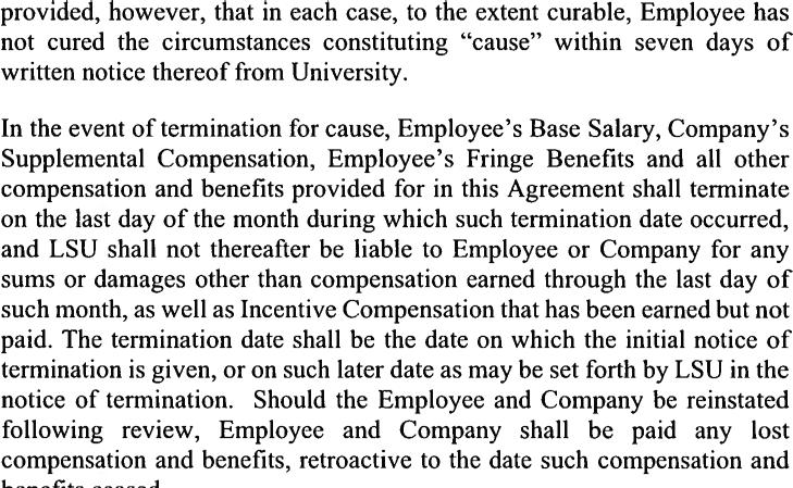 47. Under the express terms of Section 11.A.3 of the Agreement, if LSU were to assert cause, it was required to do so in writing prior to Coach Kelly’s termination and to provide a seven-day cure period. (Agreement § 11.A.1.)