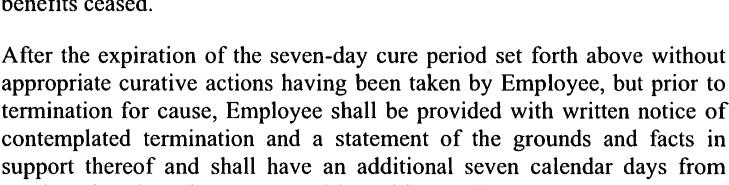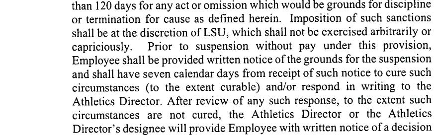 24. If LSU terminates Coach Kelly for “cause,” it is required to provide Coach Kelly an initial written notice and to provide a seven-day cure period. (Agreement § 11.A.1.) If no cure occurs after seven days, then LSU is required, “prior to termination for cause,” to provide Coach Kelly further “written notice of contemplated termination and a statement of the grounds and facts in support thereof ” (Agreement § 11.A.3.) Coach Kelly would then be entitled to “an additional seven calendar days from receipt of such notice to respond in writing and/or present documents or other written evidence to theAthletics Director” (Id.) Following any review by theAthletics Director, LSU would again need to provide Coach Kelly with written notice of a decision, and he would then be afforded the opportunity to make “a written request for review to the President and submit materials for consideration ” (Agreement § 11.A.4.)