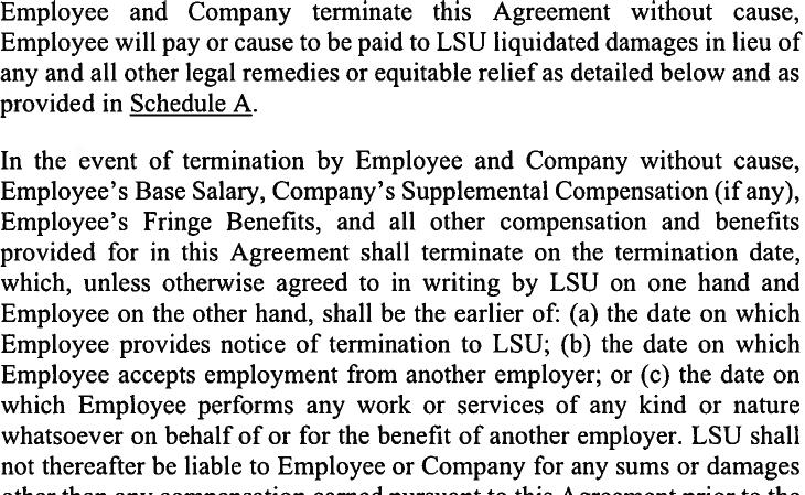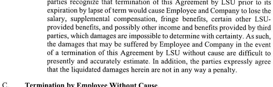 2. Coach Kelly’s Employment and IP LicenseAgreement, datedApril 8, 2022 (the “Agreement,” attached hereto as Ex. 1), expressly provides that in the event of a termination without cause, LSU must pay him certain liquidated damages. Despite this unambiguous requirement, LSU is now refusing to confirm that (i) Coach Kelly’s termination was without cause, and (ii) it will pay the full liquidated damages required under theAgreement payments to which Coach Kelly has full legal entitlement.