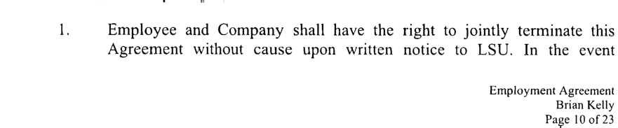 21. TheAgreement grants LSU the right to terminate Coach Kelly upon written notice (Agreement § 11.) The controlling terms differ depending on whether the termination is for “cause” or “without cause.” (Id.)