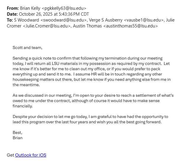 31. On October 26, 2025, the day after the TexasA&M game, Coach Kelly met with Mr. Woodward, Julie Cromer,Austin Thomas and VergeAusberry, then-executive deputy athletics director (now permanentAthletics Director). In this meeting, LSU terminated Coach Kelly, acknowledging that this termination was without cause. Coach Kelly confirmed the substance of this meeting to Mr. Woodward later that day, and noted that he would be “open to [LSU’s] desire to reach a settlement” but that it had to “make sense financially” (Ex. 2.)
