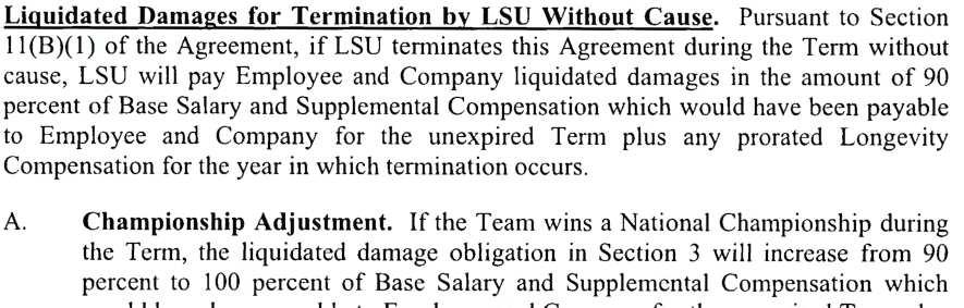 Schedule Aof theAgreement provides that upon termination “without cause,” LSU will pay Coach Kelly liquidated damages in the amount of 90 percent of both his Base Salary and Supplemental Compensation, which would have been payable to Coach Kelly for the unexpired Term. (Schedule A§ 3.) He is also entitled to any prorated Longevity Compensation for the year in which termination occurs. (Id.) In addition, upon termination “without cause,” LSU is required to pay Coach Kelly any compensation he earned prior to the termination date. (Agreement § 11.B.2.)