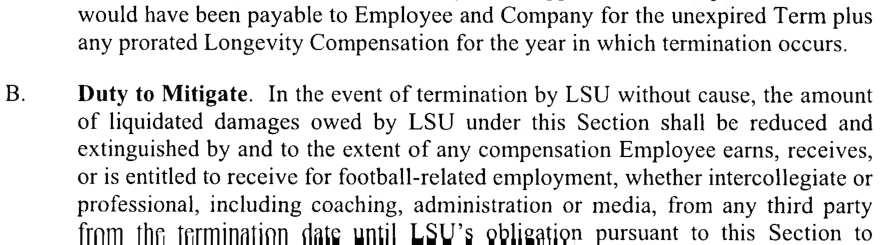 23. So long as the liquidated damages obligation remains in effect, Coach Kelly is under a duty to exercise due diligence and good faith in seeking football-related employment. (Schedule A§ 3.B.) Qualifying employment includes intercollegiate or professional coaching, administration or media positions. (Id.) The amount owed by LSU shall be reduced by any compensation Coach Kelly earns or receives from the termination date until LSU’s liquidated damages obligation ceases to exist (Id.) Coach Kelly shall notify LSU of any compensation and