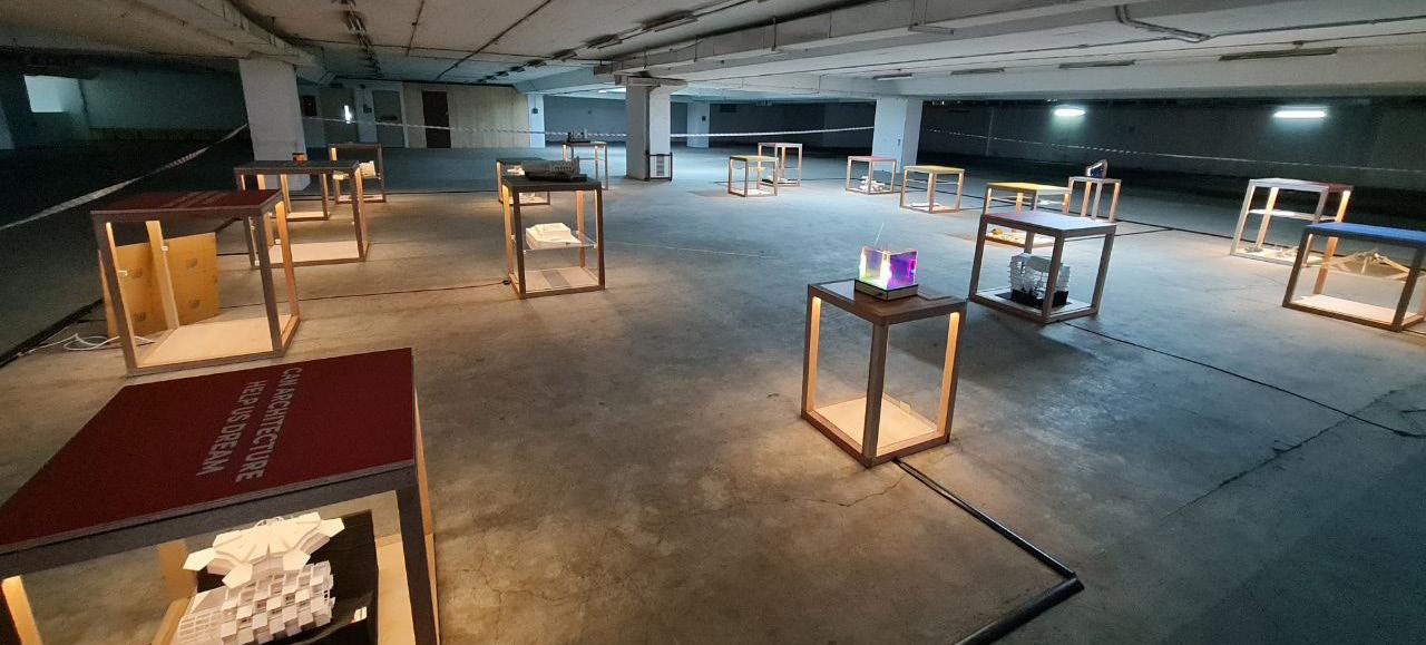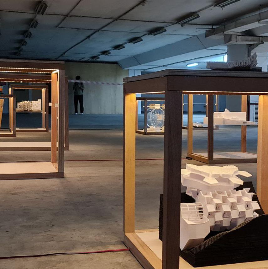 The exhibition explores the use of the simple cube to create a module that allows for the model and posters of various projects to be displayed while posing questions to the public to imagine what Architecture could be.