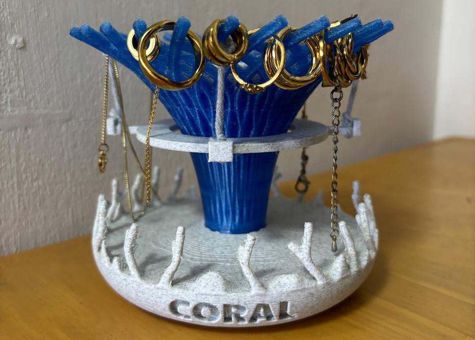 The jewellery holder takes reference from the “Super-trees” found at Gardens by the Bay as well as the OCBC Treetop Walk while the base is skirted with corals.