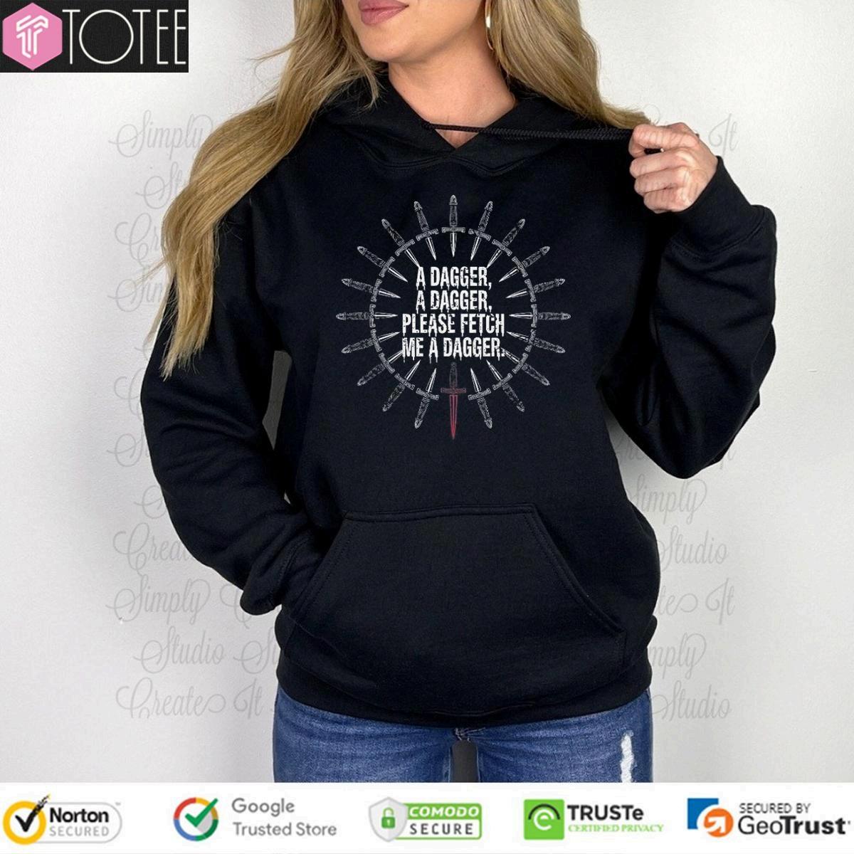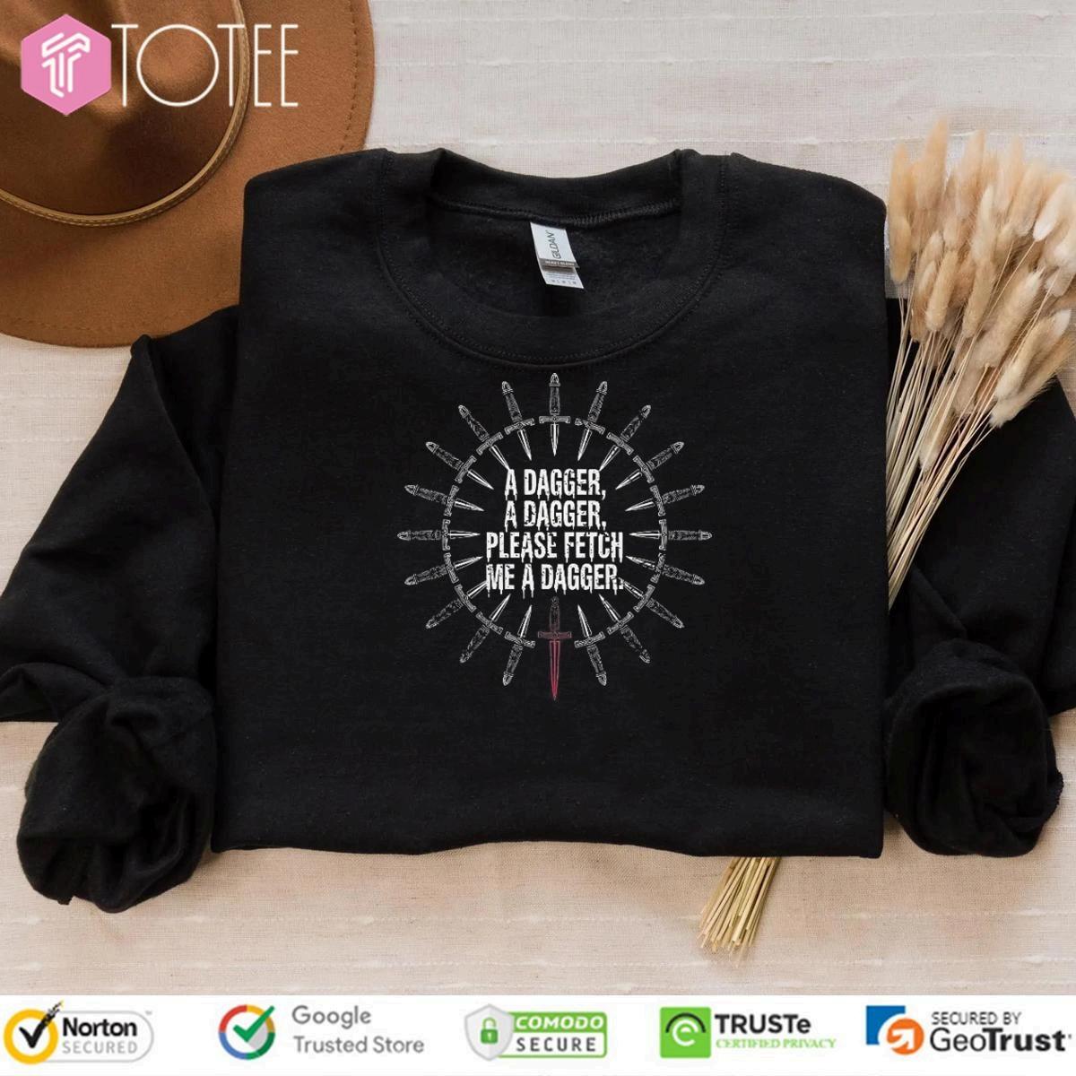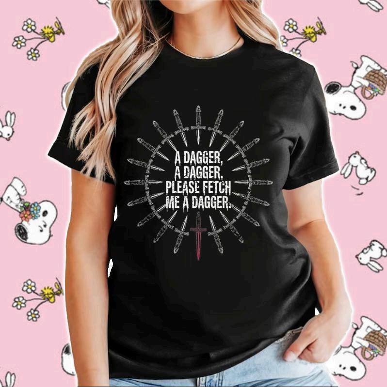 Stayaheadofthe "ADaggerADaggerPleaseFetchMeADaggerT-shirt"curvewith ourselectionoftrendy"ADaggerADaggerPleaseFetchMeADagger"t-shirts.We constantlyupdateourinventorywiththelateststylesanddesigns,ensuringyou alwayshaveaccesstothefreshestapparel.Findagreatcollectionofstylishtees, perfectlysuitedforanyoccasion.Ourshirtsaremadetokeepyoucomfortableand lookingstylish.Explorevariouscolorpalettesanddesignaestheticsthatresonate withyourpersonaltaste.Don'tmissoutontheopportunitytoownafashionableand memorablegarment.Startyoursearchnowanddiscoveranewfavorite!