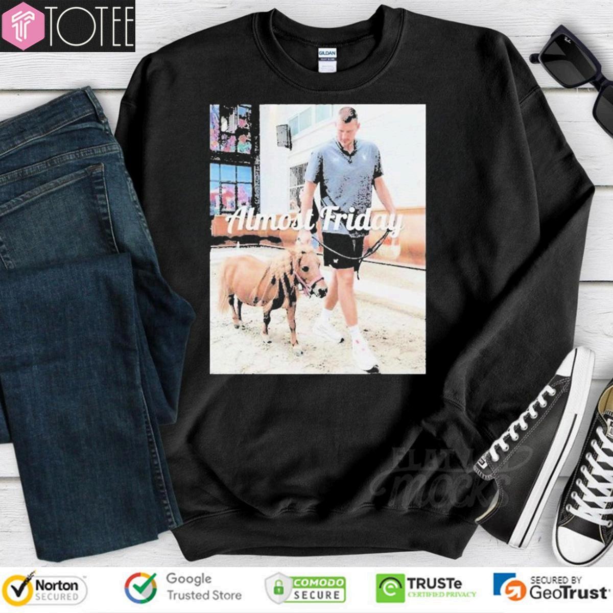 Expressyour "AlmostFridayNikolaJokicHorseBabyT-shirt"admirationforNikola Jokicandyouranticipationfortheweekendwiththestandout"AlmostFridayNikola