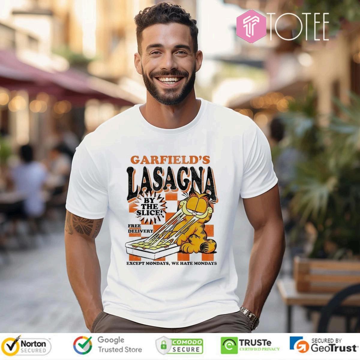 Collection:GarfieldslasagnabytheslicenearmewithfreedeliveryexceptMondays,WheretobuyaGarfieldlasagnabytheslicet-shirt,Garfieldlasagnabythe slicet-shirtfordeliveryonanydaybutmonday,FunnyGarfield"WeHateMondays"lasagnaslicet-shirt,Garfieldlasagnaslicet-shirtwithfreeshippingandno mondaydelivery
