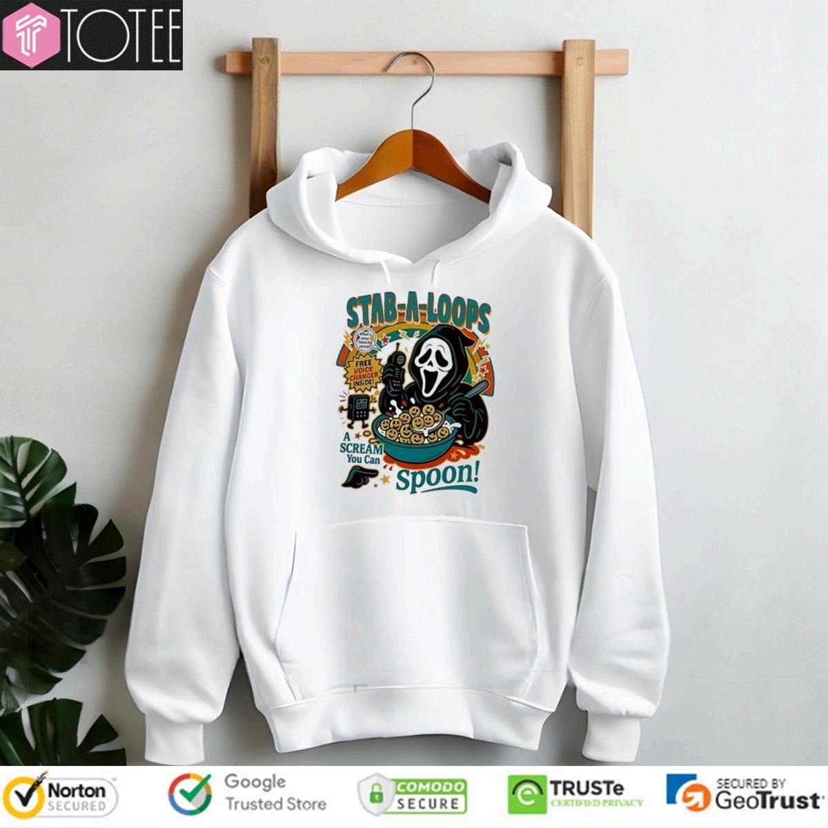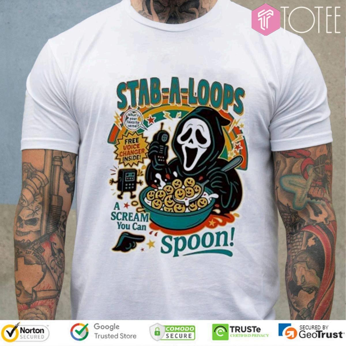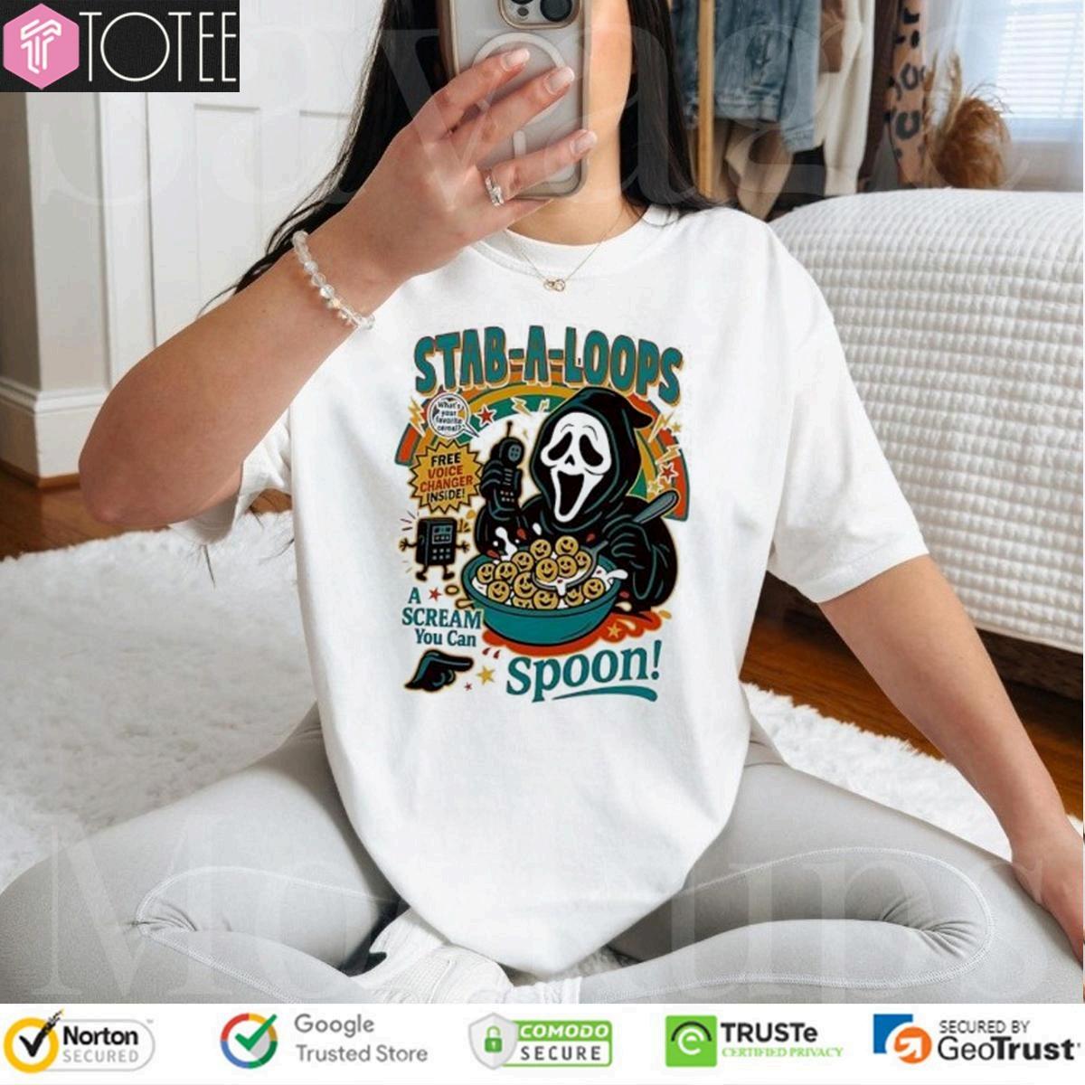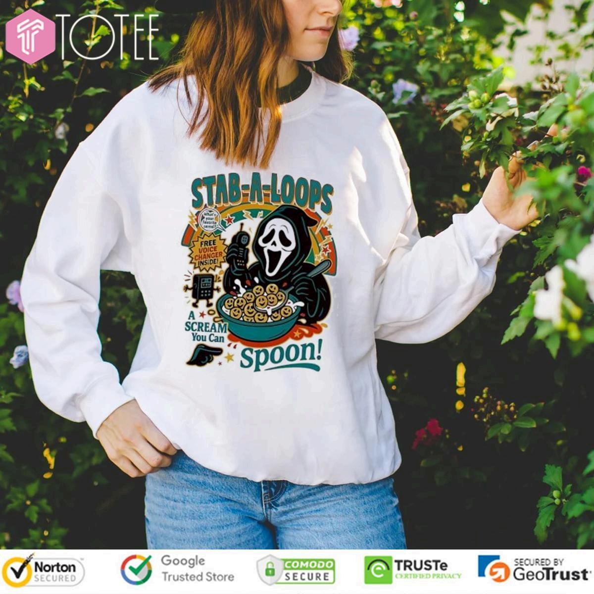 Horrorfans,this "GhostfaceStabALoopsAScreamYouCanSpoonHalloweenTshirt"one 'sforyou!AcquireyourGhostfaceStabALoopsAScreamHalloweenT-shirt andproudlydisplayyourpassionfortheScreamfranchise.Thisexclusiveteeisa conversationstarterandatestamenttoyourloveofallthingsspooky.Thisunique pieceofapparelismorethanjustat-shirt;it'sastatement.Thedesigncapturesthe essenceoftheiconicslasher,blendingfearandfunintoonestylishgarment.Wearit toahorrormoviescreening,aHalloweengathering,orjusttoshowcaseyouraffinity forthegenre.Getyourhandsonthismust-havet-shirtandembracethechilling charmofGhostface.