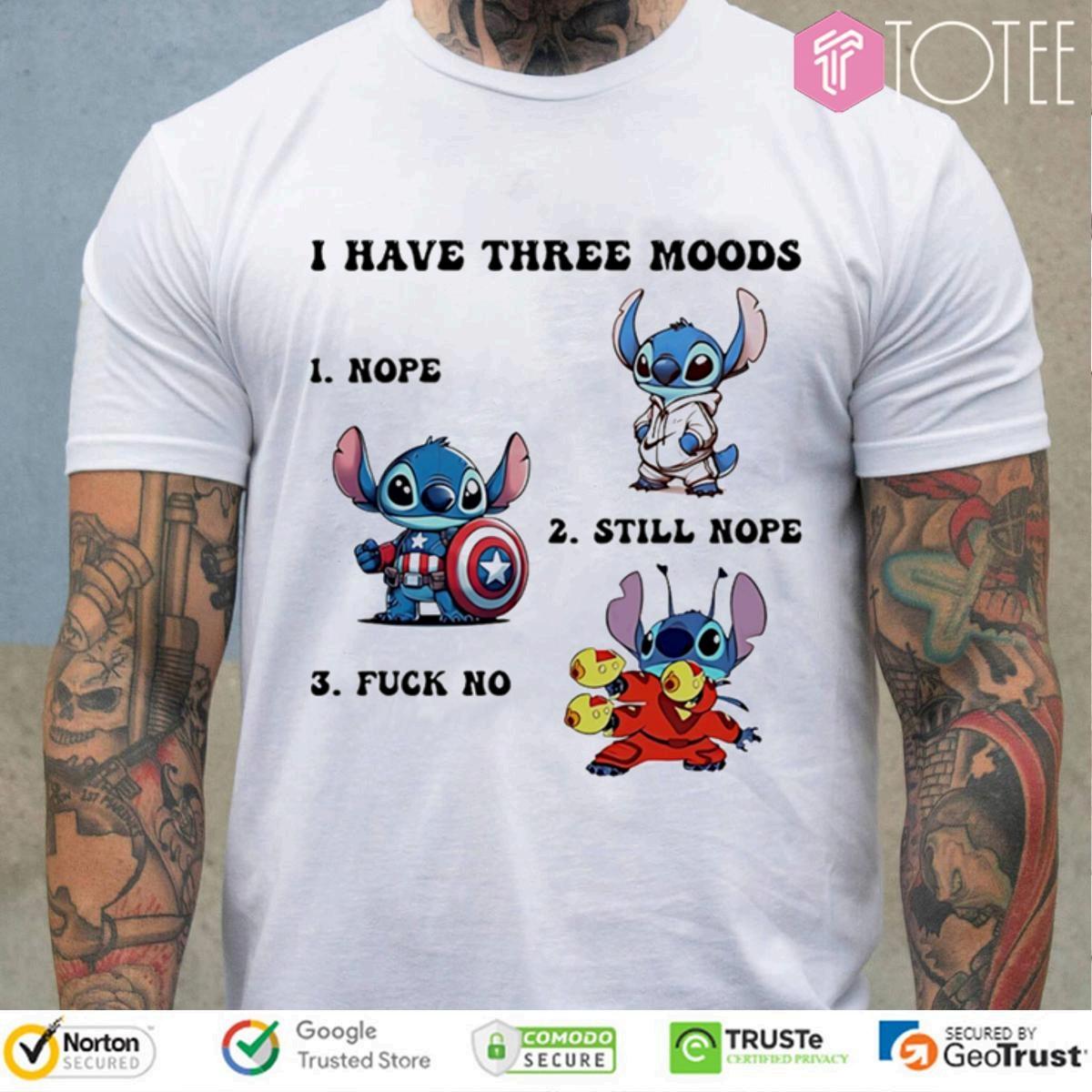 A "IHaveThreeMoodsStitchCaptainAmericaNopeStillNopeFuckNoT-shirt"