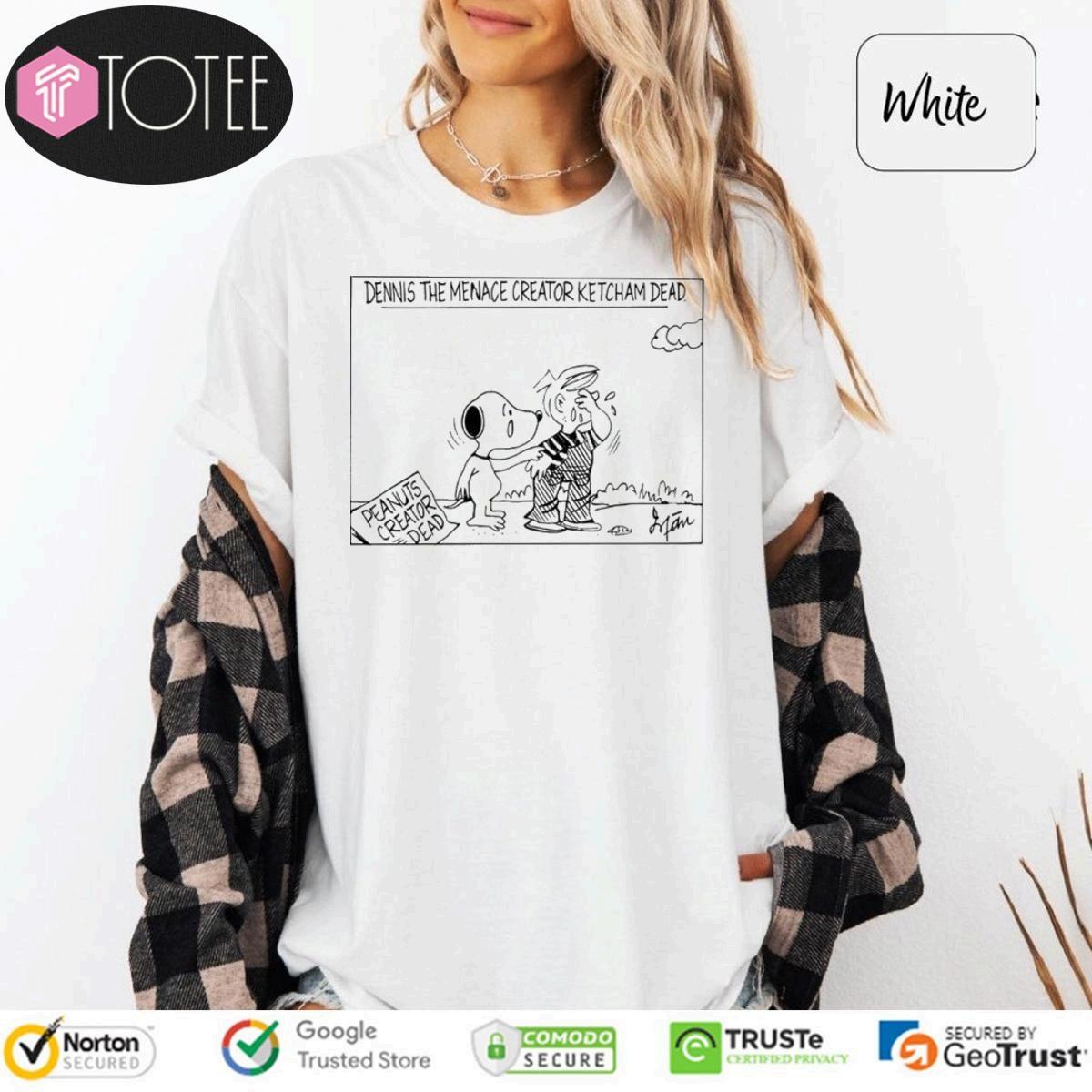Stepbackintimeandcelebratethe "PeanutsSnoopyDennisTheMenaceCreator KetchamDeadT-shirt"creativegeniusofCharlesSchulzandHankKetchamwitha unique**t-shirt**.Thiswearableartworkpayshomagetothemenbehindtheiconic characters,SnoopyandDennistheMenace.The**t-shirt**servesasavisual representationoftheircontributiontotheworldofcomicsandpopularculture.From thephilosophicalmusingsofSnoopytotheplayfulanticsofDennis,this**t-shirt** beautifullyintertwinestheessenceofthesecomicstriptitans.Thisismorethanjust merchandise;it'saheartfelttribute,allowingyoutocarryapieceofcomichistory withyou.Showyourappreciationforthecreatorsandthememoriestheycreated witheverywear.