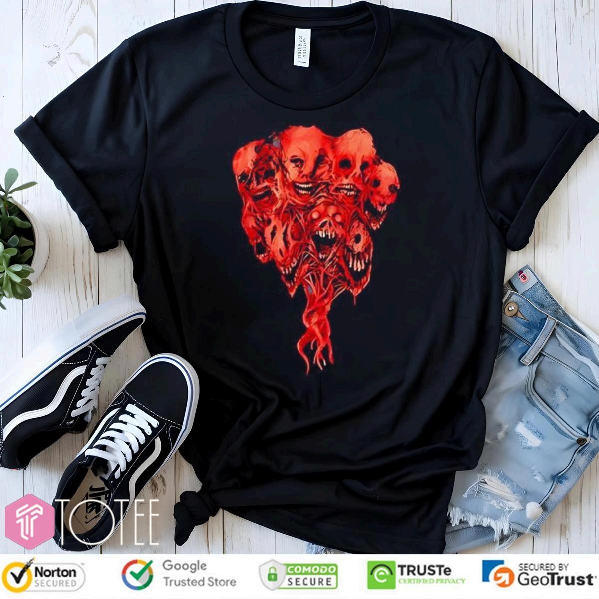 redskullt-shirtwithmultiplezombiefaces creepyeyesdesignredhumanskullt-shirt