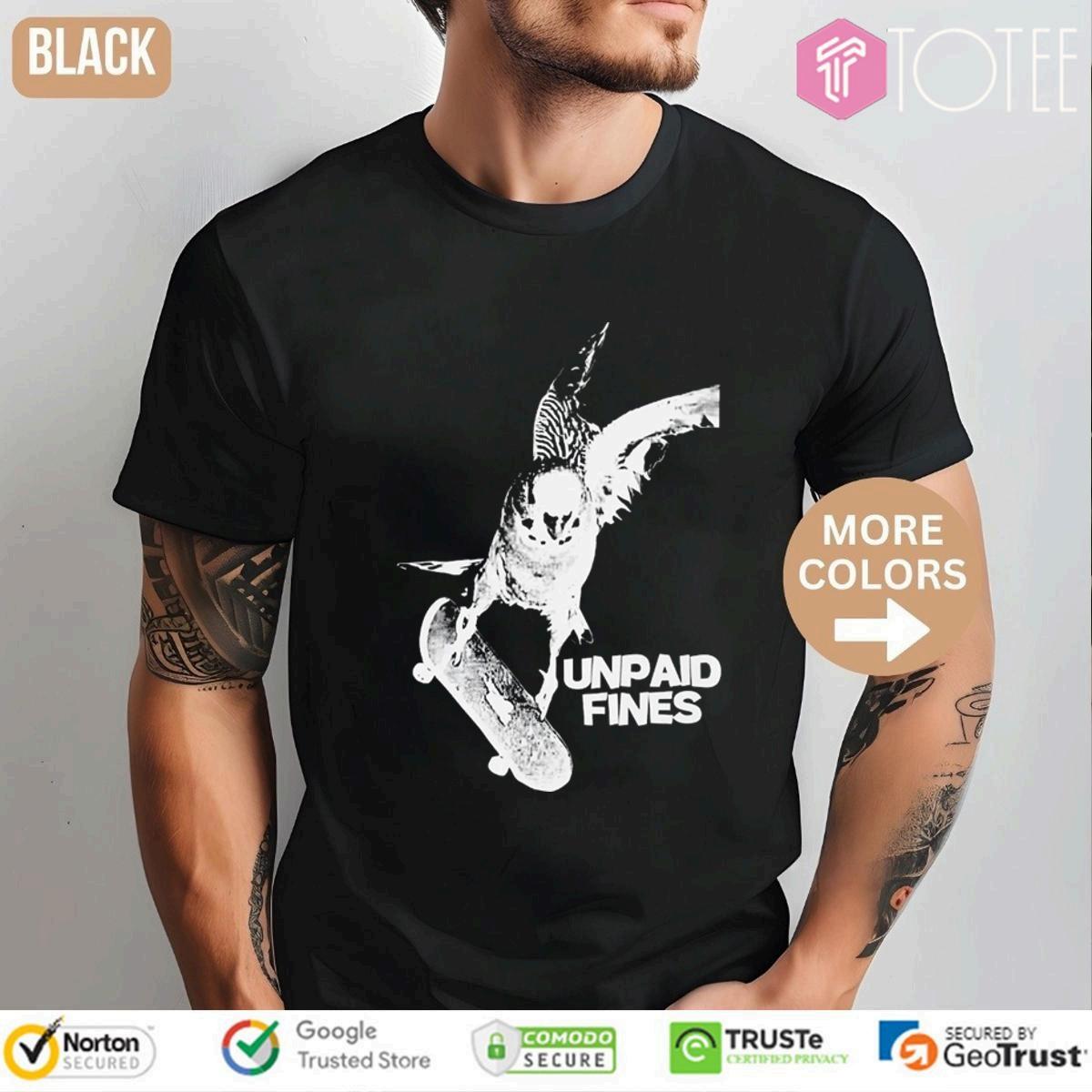 ShowoffyourrebelliousstylewiththeUnpaidFinesBirdOn Skateboardtee!Grabyourstodayandwearyourattitude.Limited stock-getyoursnow!