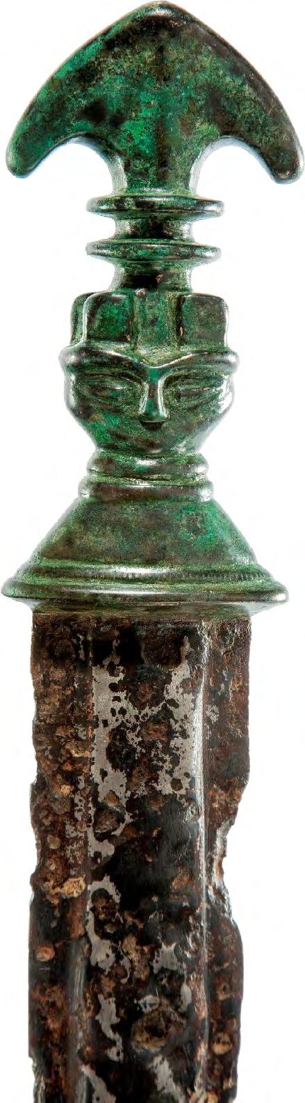 With tapering iron blade, the bronze hilt with waisted elliptical guard surmounted by an anthropomorphic head shaped handle, surmounted by two discs and and a crescentic bifurcated pommel.