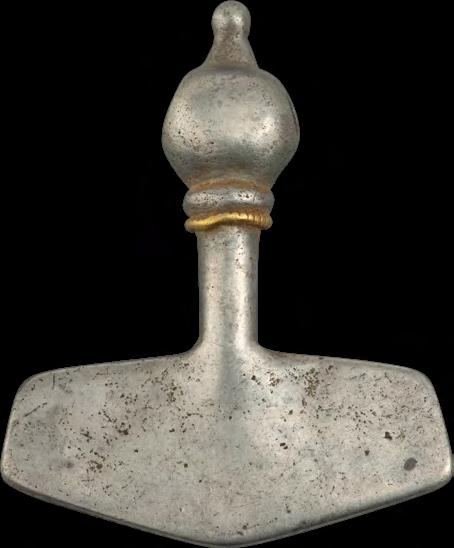 Cast in the form of Mjollnir or Thor’s hammer, and decorated with interlacing designs on the head, a plain silver haft and a stylised face synonymous with an example found on the prow of the Oseberg Ship on the terminal, also acting as a suspension loop.