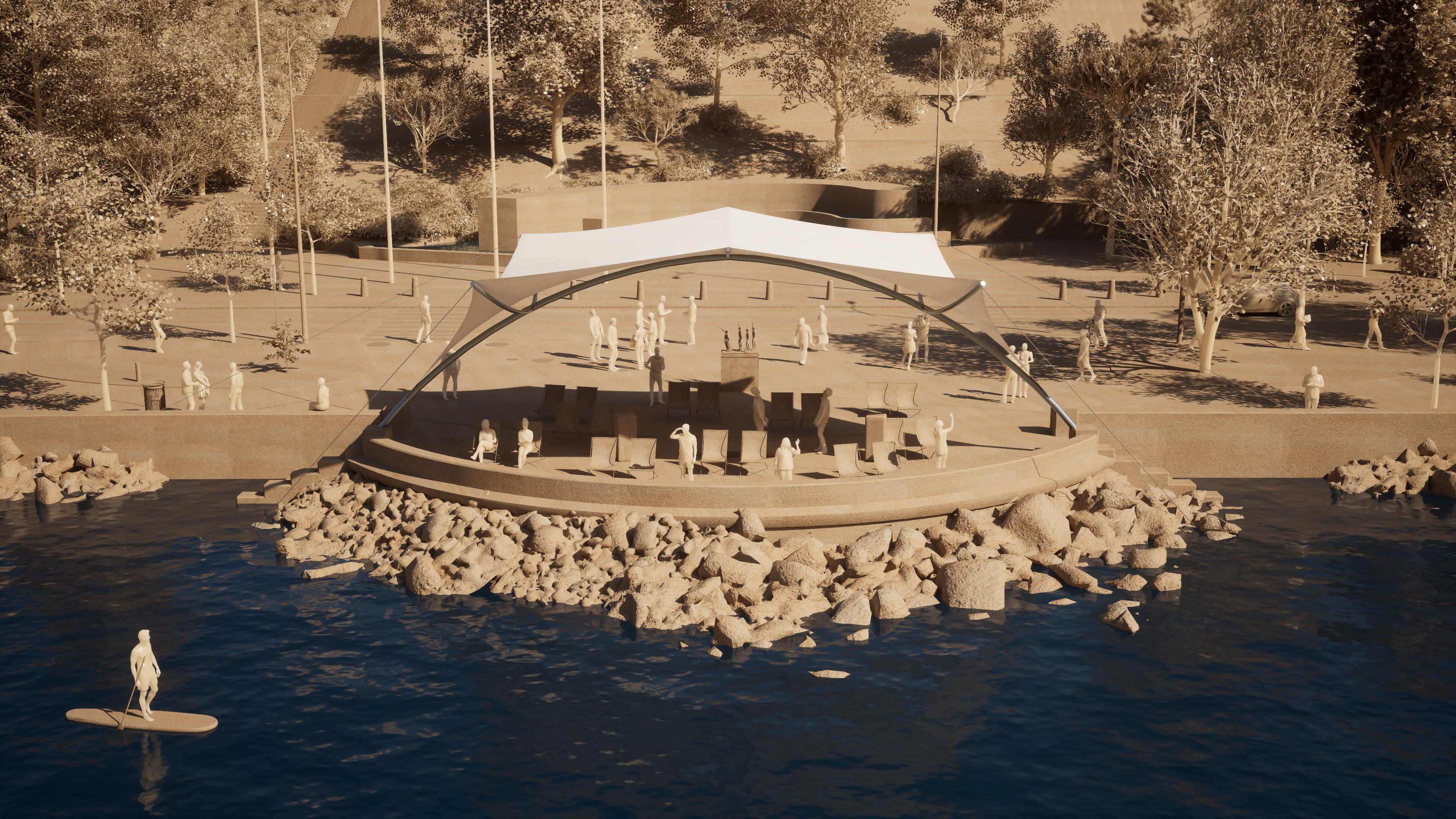 Un geste architectural qui encadre la vue sur le lac, désigne l'emplacement du point de vue et offre de l'ombre contre le soleil brûlant.