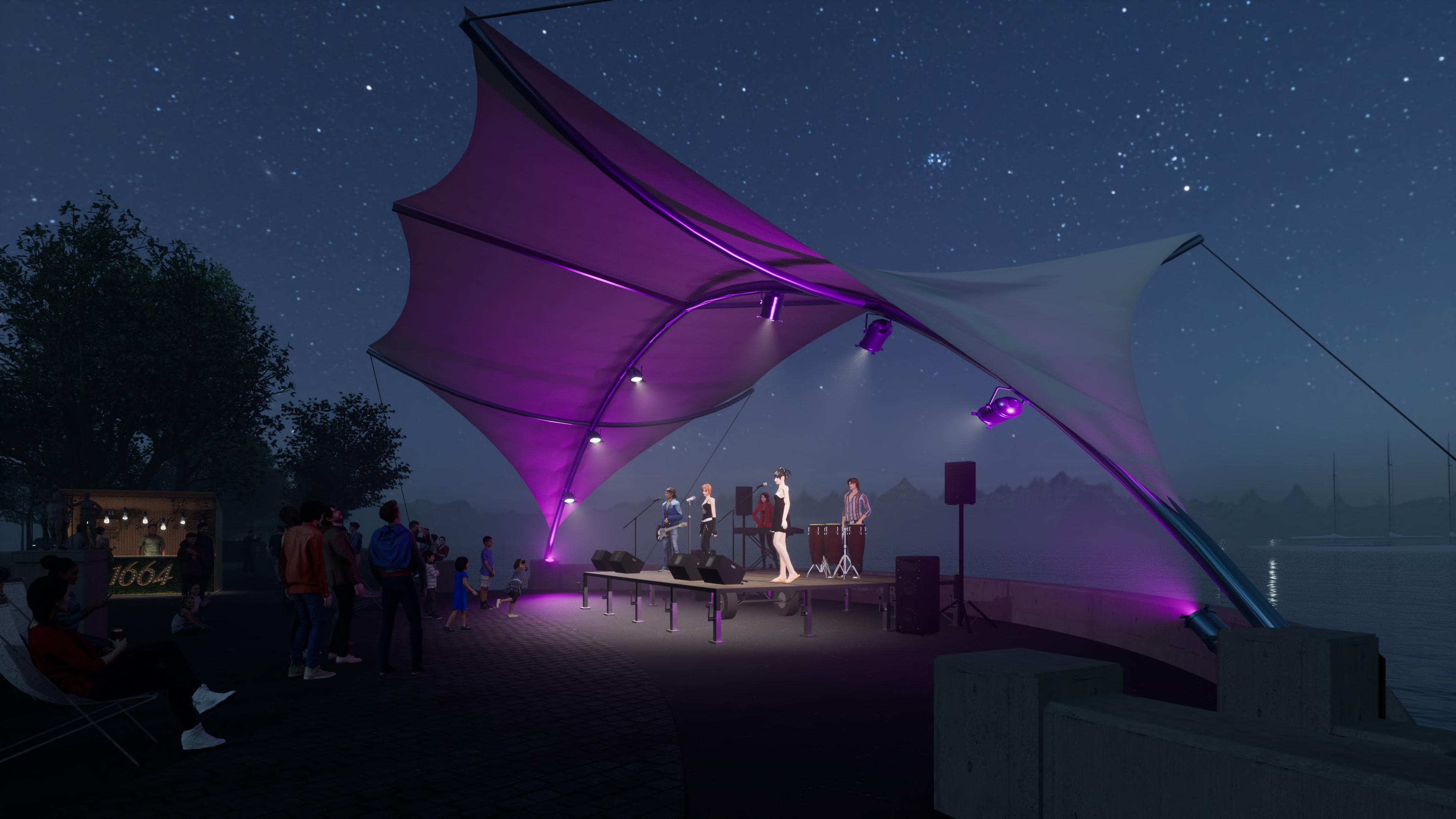 Illuminée de lumières colorés, la voile en suspension devient une toile de fond chalereuse propice à l'animation de bars à cocktails et de concerts. Elle offre en tout temps sa protection enveloppante
