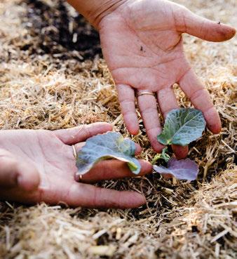 ‘De start van mijn eigen ecosysteem! Alles begint bij de bodem. Die moet in balans zijn. Zo teel ik NieuwZeelandse spinazie, een natuurlijke bodembedekker die als natuurlijke mulch dient. De aarde moet zoveel mogelijk bedekt blijven, en daarmee beschermd tegen de weerselementen. Ons groenafval composteer ik tot nieuwe aarde. Die hergebruik ik op de bedden. Zodoende keren de voedingstoffen terug in de bodem.’