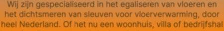 Wij zijn gespecialiseerd in het egaliseren van vloeren en het dichtsmeren van sleuven voor vloerverwarming, door heel Nederland. Of het nu een woonhuis, villa of bedrijfshal betreft, wij gaan geen uitdaging uit de weg. U kunt rekenen op vakwerk, topkwaliteit en oplossingen: de perfecte basis voor elke vloerafwerking.