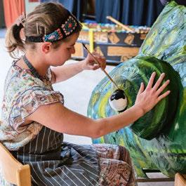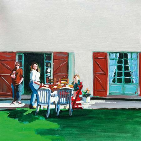 Aan het maken van een schilderij gaat geen uitgebreide schets vooraf. ‘Ik schilder met snelle toetsen. Heel spontaan. Al schilderend volgt de ene stap op de andere. Als een collage voeg ik de elementen en de mensen samen. Soms verplaats ik iets of iemand bij nader inzien. Noem het fotoshoppen met verf. Ik ben gek op felle kleuren. Een schilderij is voor mij een speeltuin!’ •