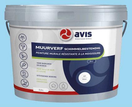 Avis Muurverf is een matte schimmelbestendige muurverf bij uitstek geschikt voor vochtige ruimten. Schimmelbestendig door een blijvend flexibele, niet-thermoplastische verffilm. Avis Muurverf Schimmelbestendig is waterverdunbaar en geschikt voor het afwerken van vrijwel alle ondergronden zoals nieuw pleisterwerk, cement, beton, en stucwerk. Poederende of zuigende ondergronden voorbehandelen met Avis Fixeergrond.