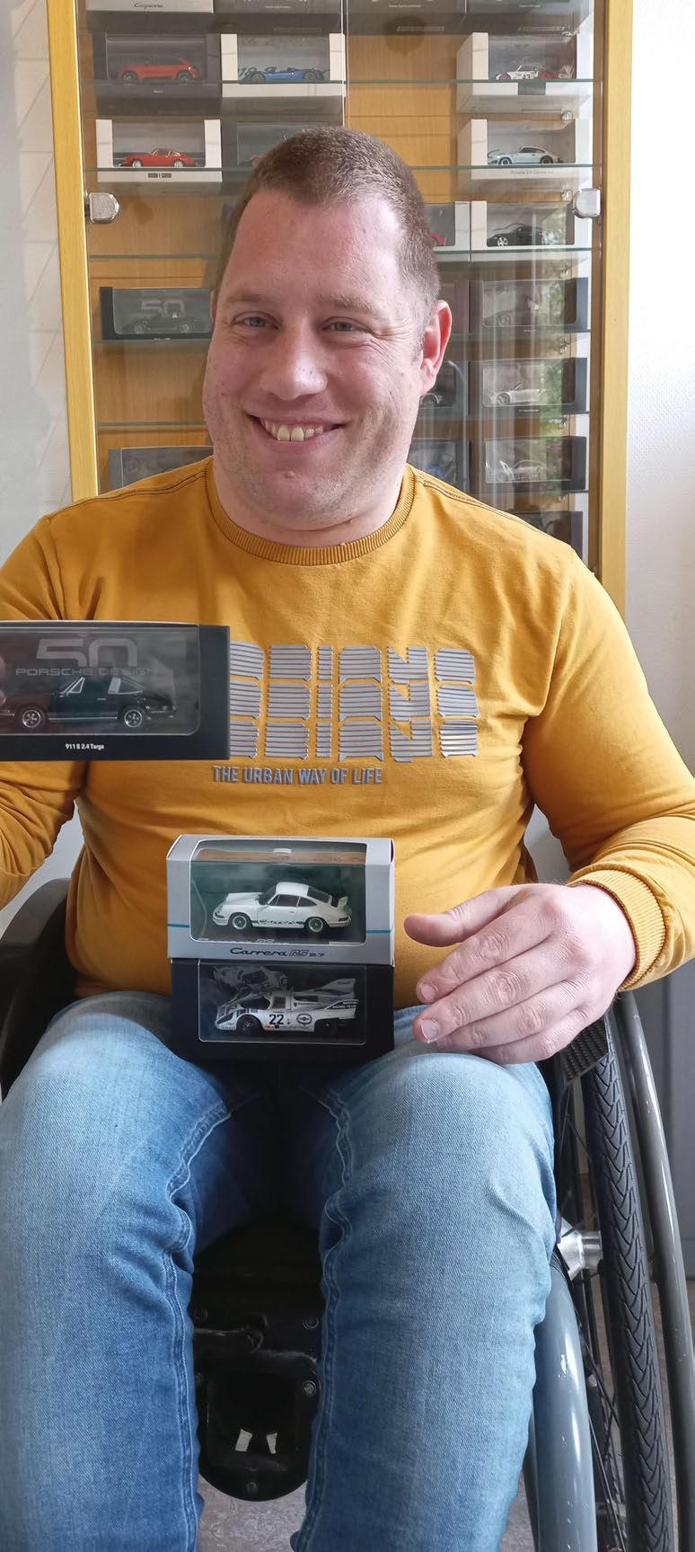 De fervente autoliefhebber werkt bij sociaal werkbedrijf IW4 in de montage en verpakkingsindustrie. Zelf een rijbewijs halen is helaas geen optie. ‘Ik ben prematuur geboren met complicaties, waardoor ik een verbale leerstoornis heb en aan een rolstoel ben gekluisterd. Daar heb ik inmiddels vrede mee. Gelukkig kan ik wel van mijn kleine auto’s genieten.’ •