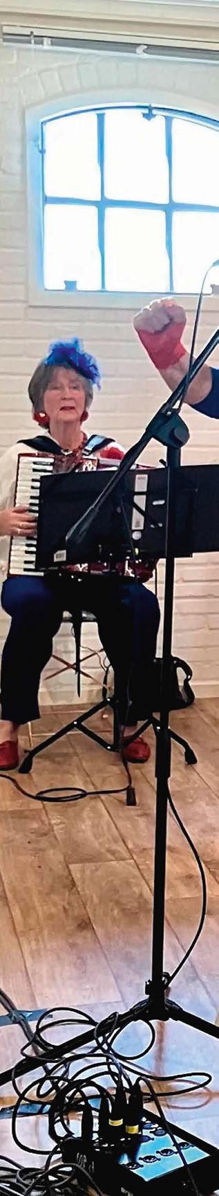 contact met het publiek onderhouden. Grappige interacties met individuele toehoorders. Dan heb je de lachers op je hand. Een enthousiaste ladyspeaker praat het concert aan elkaar. Miriam Drost begeleidt ons sinds januari alleen bij de wekelijkse repetities in De Kubus of in restaurant 3 Zussen. Muzikaal gezien tilt ze ons op een hoger plan. Sommige nummers zingen we zelfs driestemmig.’