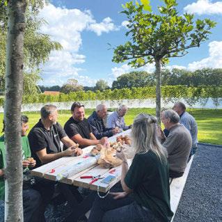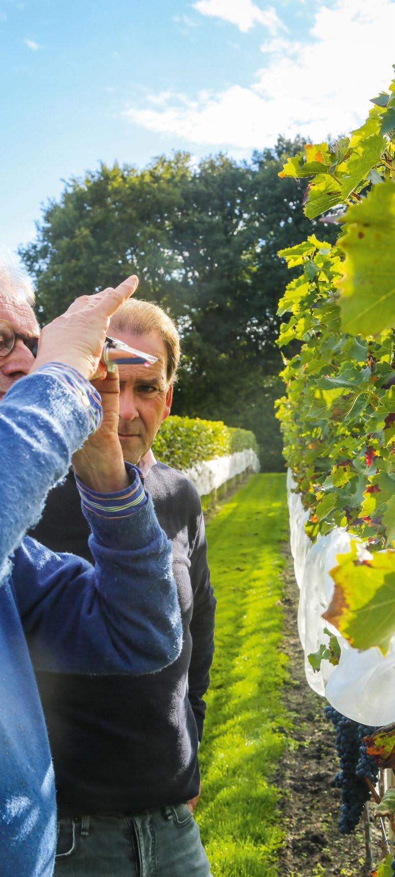 Onlangs werd de belangrijkste beslis sing van het jaar genomen: het bepalen van het oogstmoment. De combinatie van zuur- en suikergehaltes en het weer zijn daarbij doorslaggevend. En hoewel verwacht wordt dat de witte wijn zal smaken als een verfijnde Riesling, werd het Rhenens Wijndomein een haast Zuid-Europees decor. Op twee zonovergoten dagen in september plukte het hele gezin de Rooi met familie en bekenden de druiven. Inclusief smakelijke pauzes aan de lange dis, verzorgd door madre Jannette.