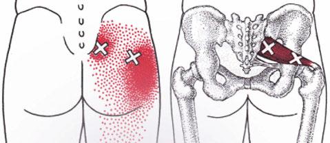 ‘Na onderzoek blijkt meestal dat de oorzaak niet in de rug zit, maar in de bil! Oorzaak is vaak een verkorting van de m. piriformis. Dit is een kleine peervormige spier, gelegen onder de grote bilspier (gluteus maximus). Daarom is de piriformis moeilijk te voelen’, legt praktijkhouder Berty uit.