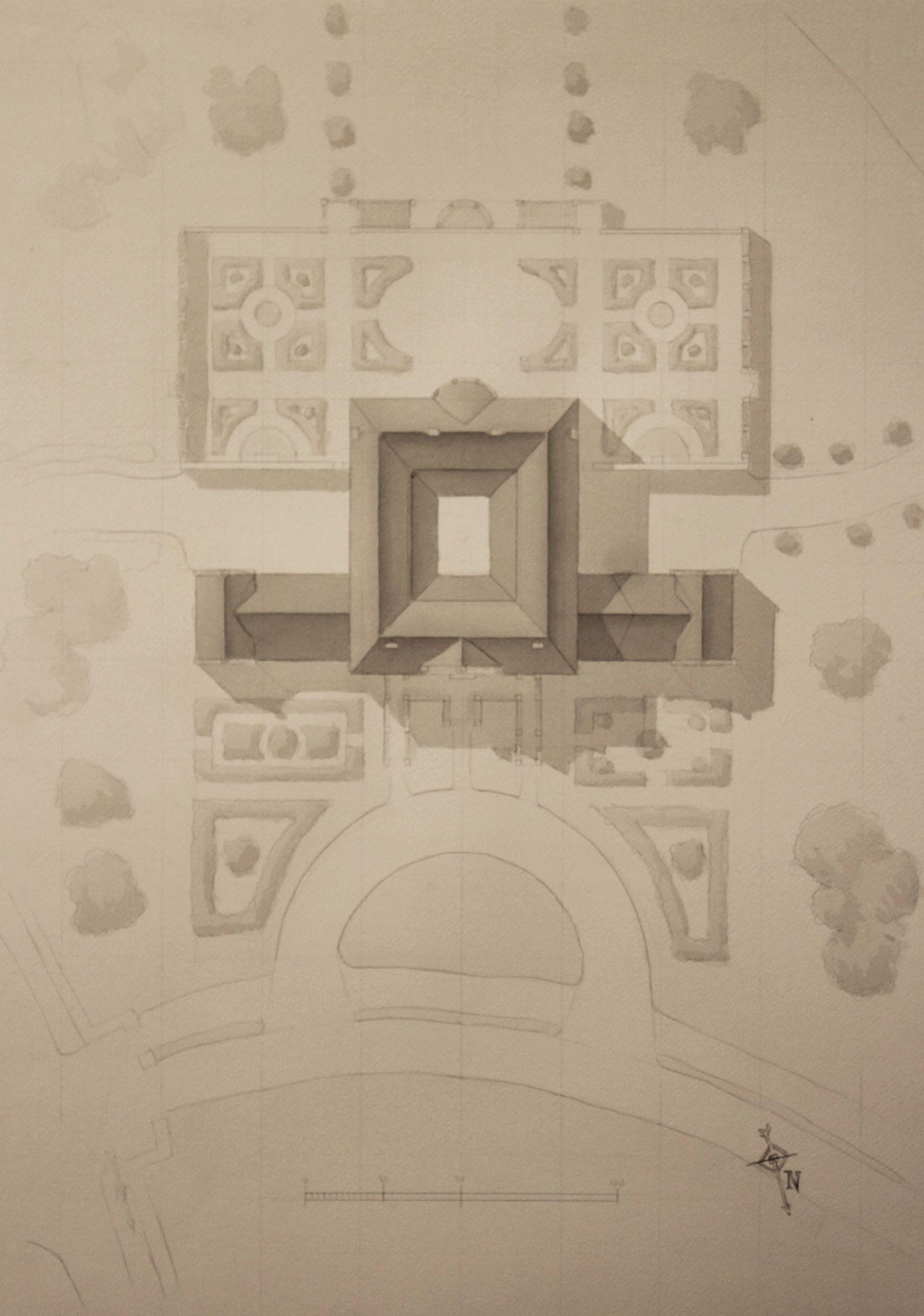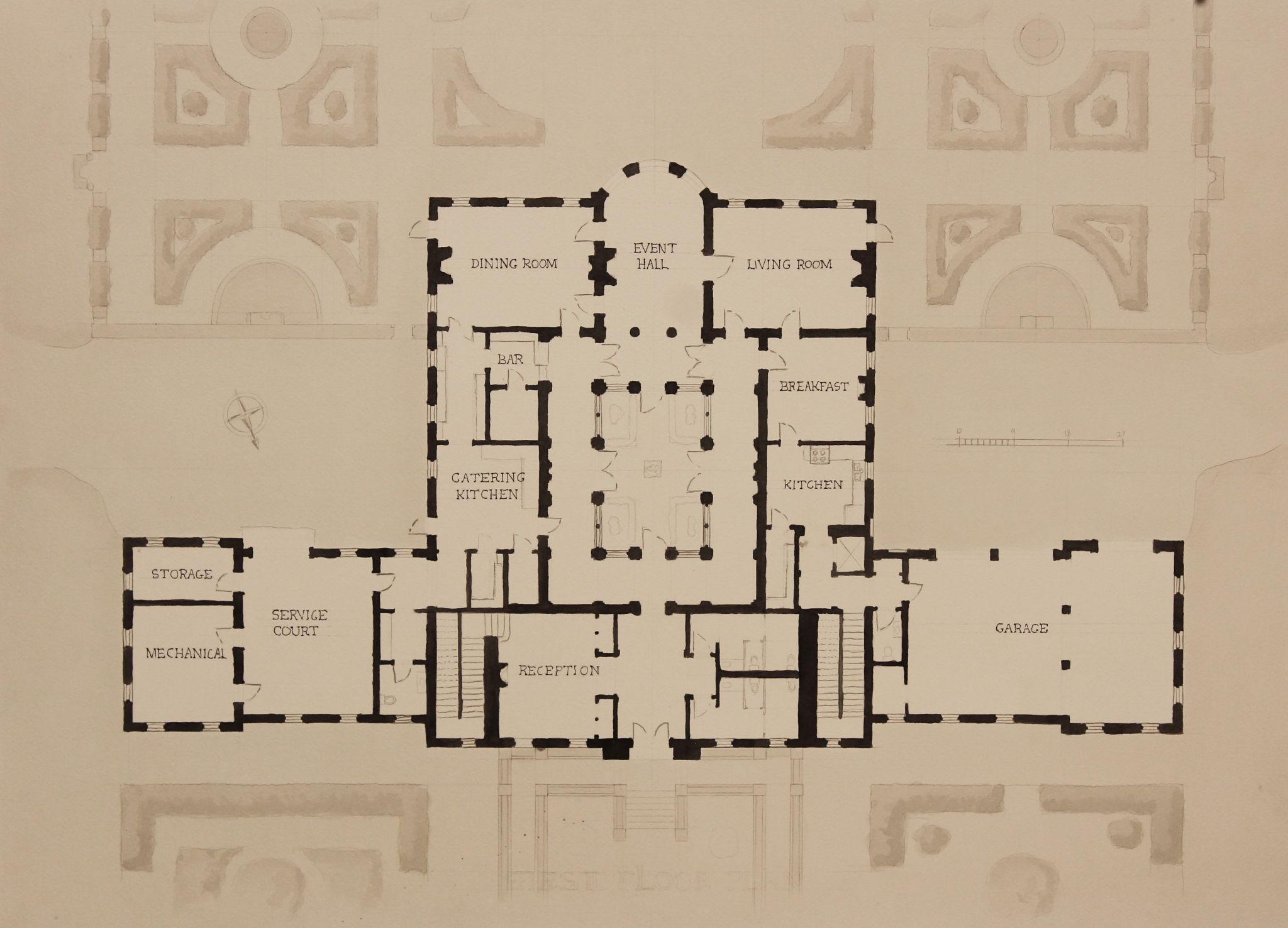 This takes place in a theoretical Catholic LiberalArts college called Marmoutier College. It’s a house for the president of the college. Its Palladian design paired with the iconographydisplaysthemeaningoftheliberalartsinonedesign.Renderedinink.