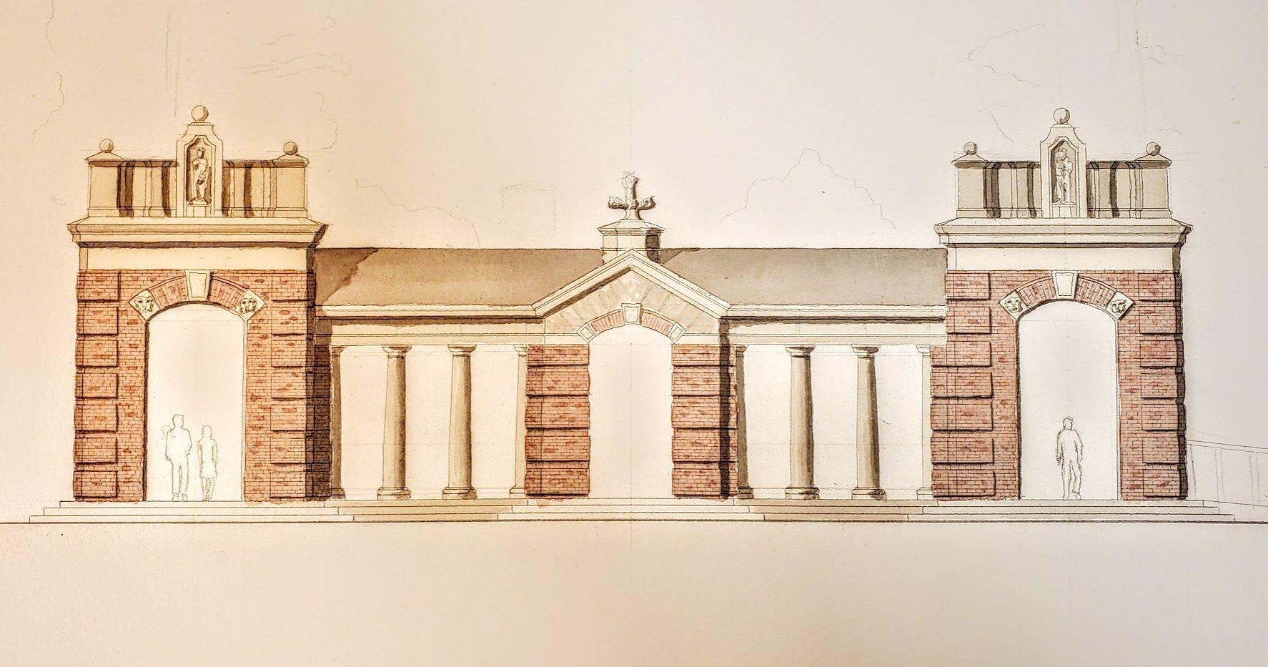 ApairofpavilionsforBenedictineCollegerenderinwatercolor.