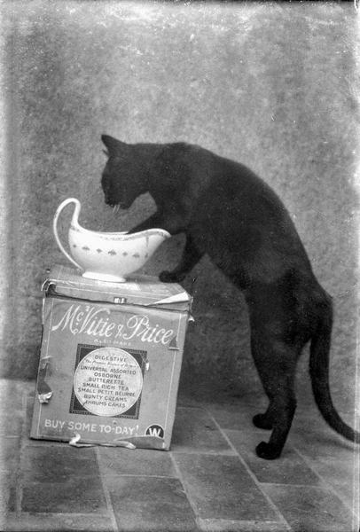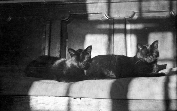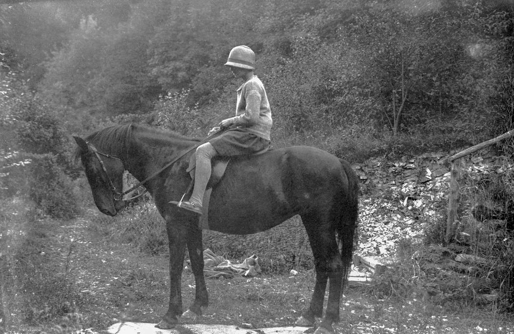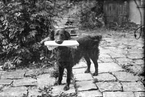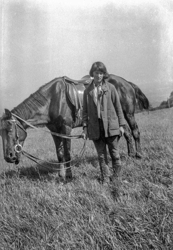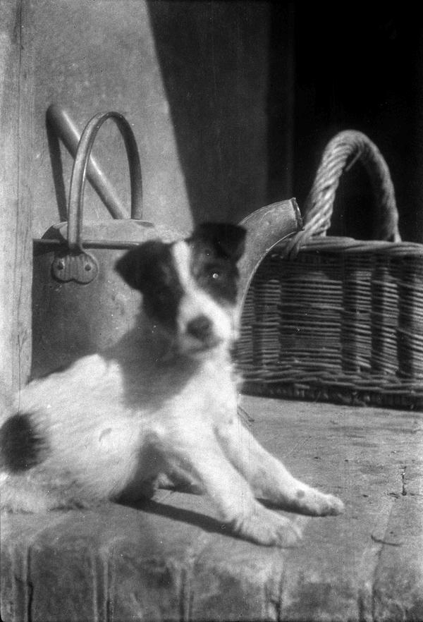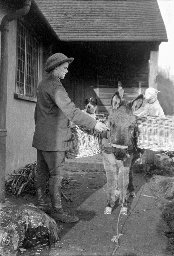 The carefully recorded descriptions for each negative in Winifred Joseph’s negative albums are a remarkable source of information about various people, places and animals. Her detailed lists include the names of over 30 dogs, such as Sam, Pudding, Tibbie, and Pax, as well as a similar number of cats, including Sylph, Kipps, and Nugget. Among the 20 horses were early favourites Brownie and Sally, accompanied by their hardworking donkey, Sooty. The records also note rabbits, ducks and even a peacock named Kit. Joseph often captured humorous moments as well as the close bond they all had with the animals.