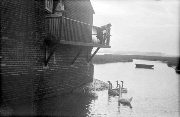 Bas Feeding Swans from Balcony of Langstone Mill
