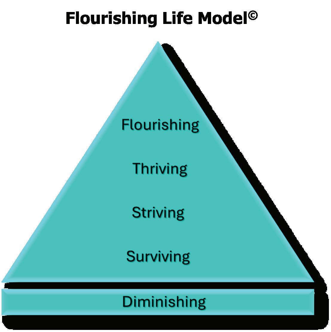 In 2017, the idea for the “Flourishing Life Model” 1 was born; however, it was incomplete. The first four levels – diminishing, surviving, striving, thriving – were developed, but it was not for another three years, in 2020, the top of the model – flourishing – finalized.