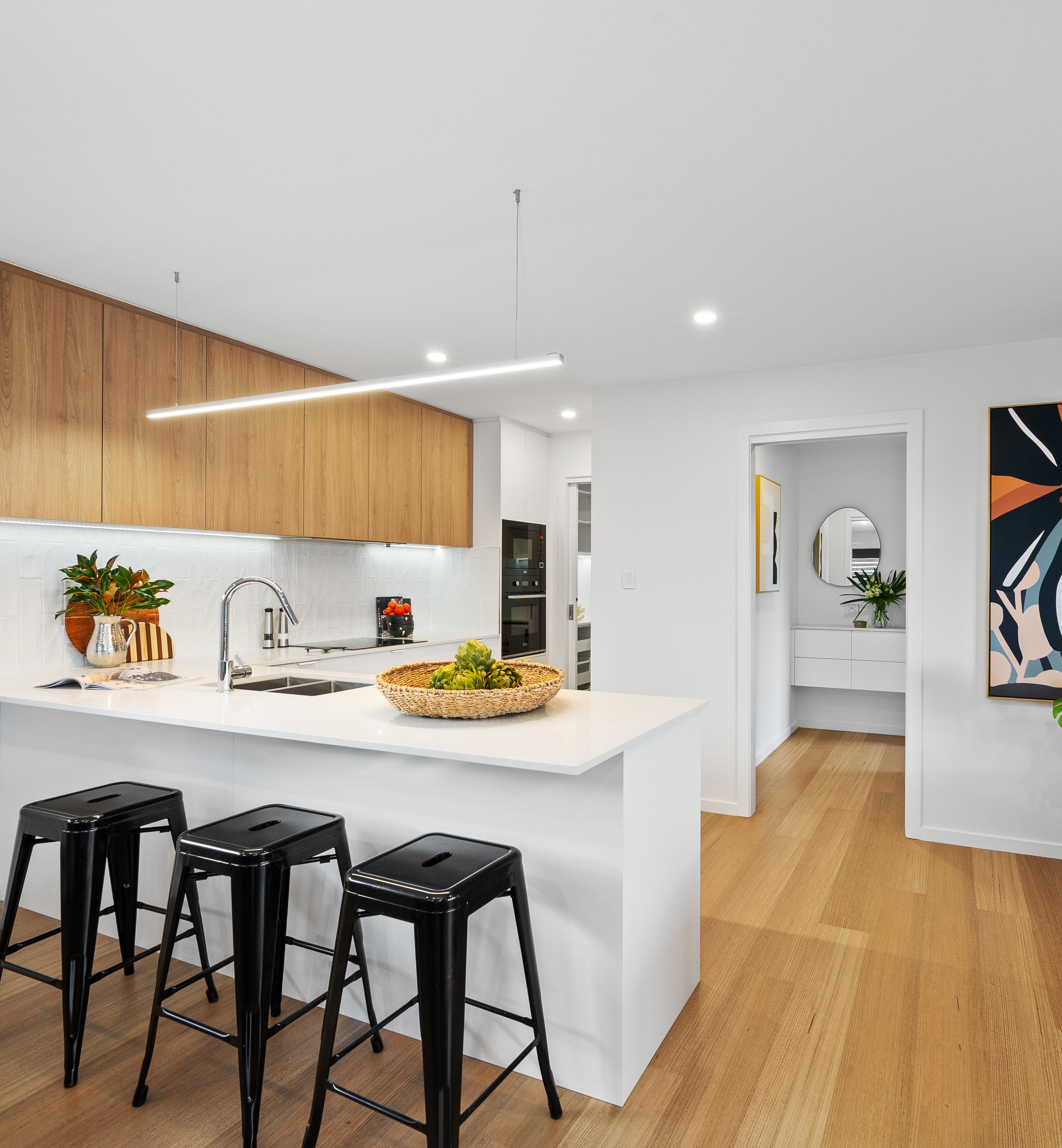 Bathed in natural light, the open-plan living area is framed by large windows and connects seamlessly to the contemporary kitchen. Appointed with quality appliances, expansive benchtops, a breakfast bar and an enviable butler’s pantry, the kitchen is designed with both style and practicality in mind. Flowing from the lounge through double sliding doors, a timber deck provides the perfect setting to relax or entertain while enjoying glimpses of the Derwent River, Hobart CBD and Mount Wellington/kunanyi.