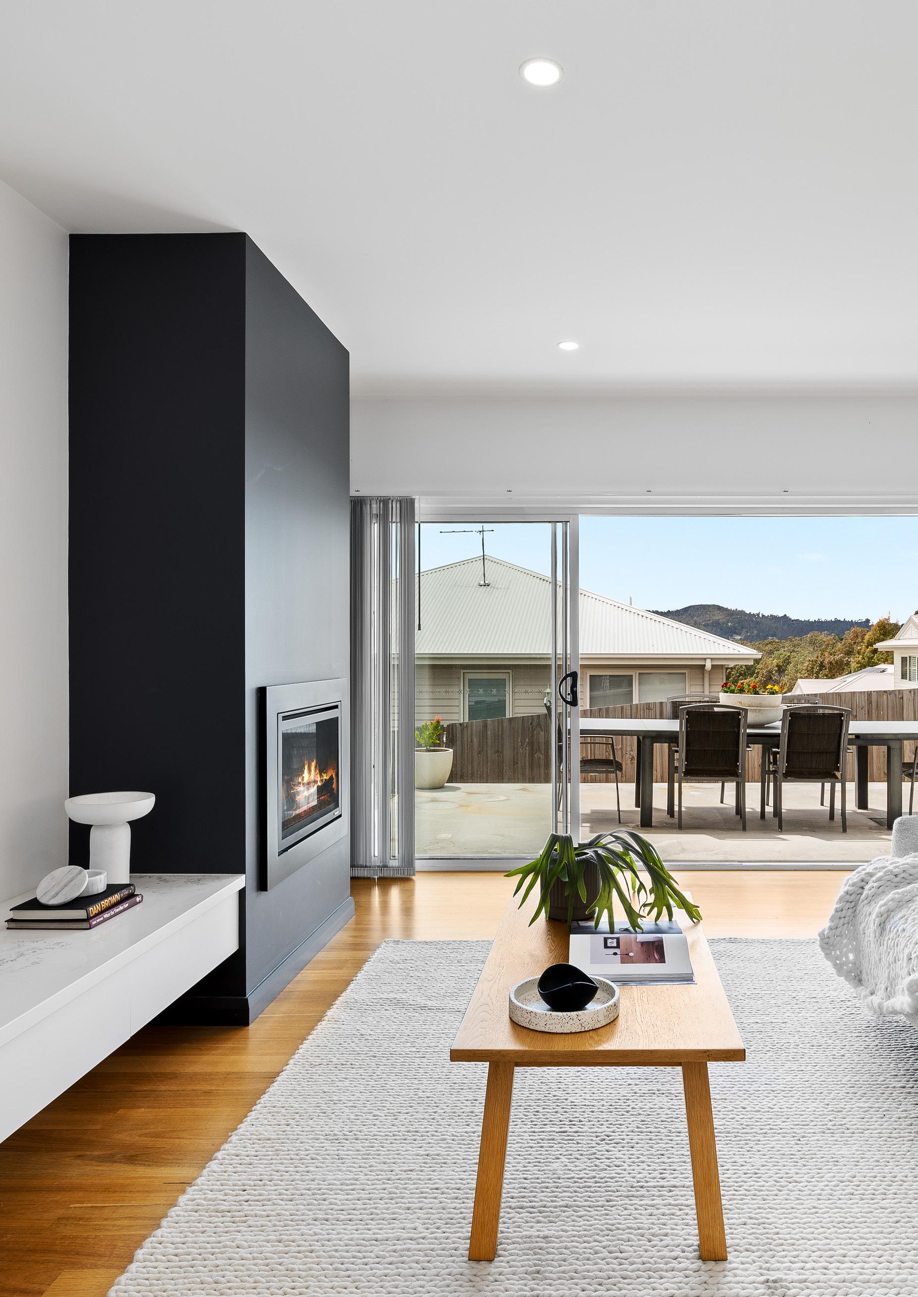 Sun-drenched open-plan living forms the heart of the home, featuring a spacious family room and dining zone enhanced by built-in window and bench seating, custom cabinetry and a gas fireplace. Indoors extend out to the courtyard and entertaining terrace, where sweeping vistas reach all the way up to the peaks of kunanyi/Mount Wellington.
