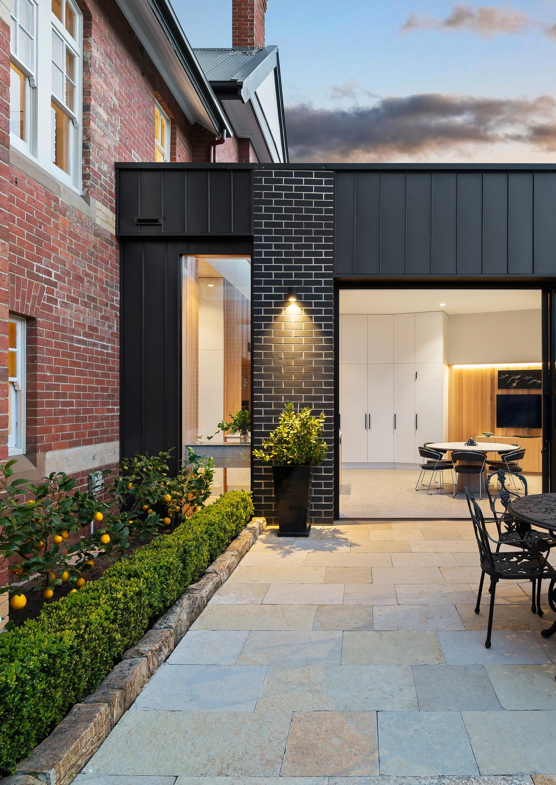Downstairs, it really is the high spec kitchen annexe that takes centre stage and it is testimony to a contemporary design aesthetic, which has been integrated seamlessly into the heritage framework. Here, polished concrete floors, stone benchtops, streamlined bespoke joinery and state of the art kitchen appliances work with the modern materials of steel, glass, timber and feature brickwork to create a stunning, albeit more casual family/ dining space. Glass steel framed sliding doors open out to a private, stone flagged sun trap courtyard complete with established citrus trees and hedges. Cleverly integrated is a European style laundry, powder room and an expansive storeroom.