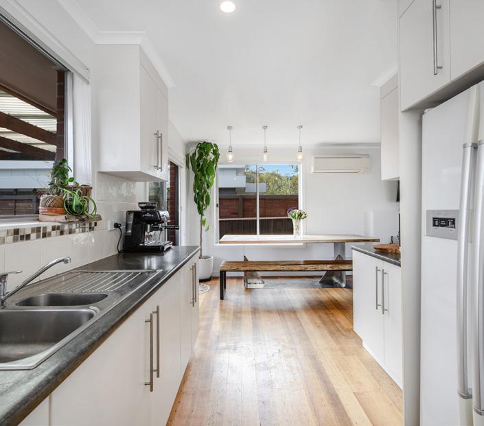 timber flooring and filled with natural light, and reverse-cycle air to ensure yearround comfort. The roomy kitchen comes