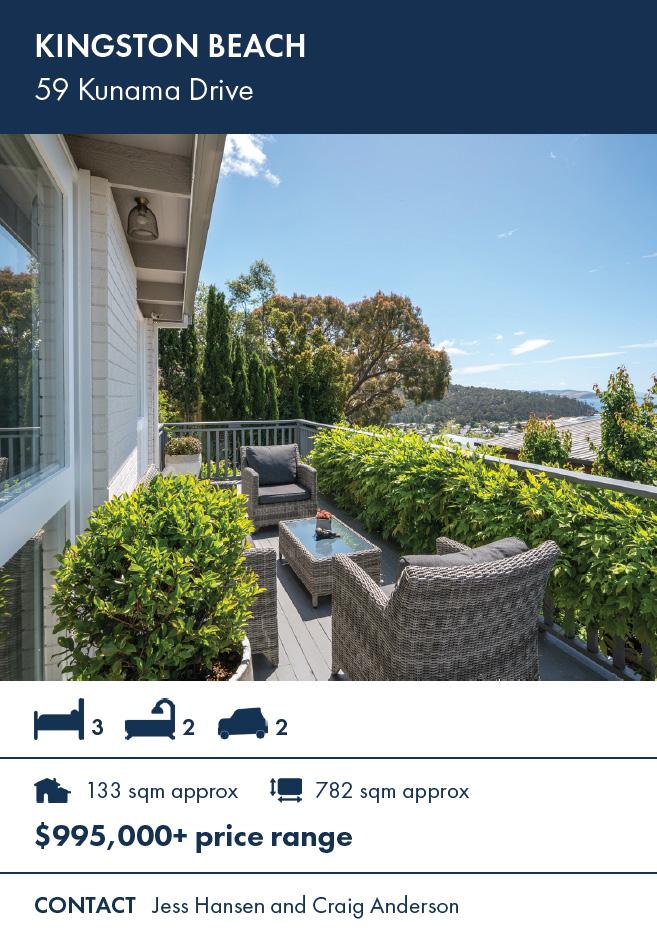 KINGSTON 1/12 Fiani Court 2 2 3 CONTACT Jeff Belbin $750,000+ price range 173 sqm approx 369 sqm approx HOBART 2/55 Patrick Street 1 2 CONTACT Craig Anderson and Jess Hansen $645,000+ price range 93 sqm approx 93 sqm approx HOBART 120-122 Murray Street 3 3 4 CONTACT Jess Hansen and Craig Anderson EOI over $3,500,000 683 sqm approx 215 sqm approx