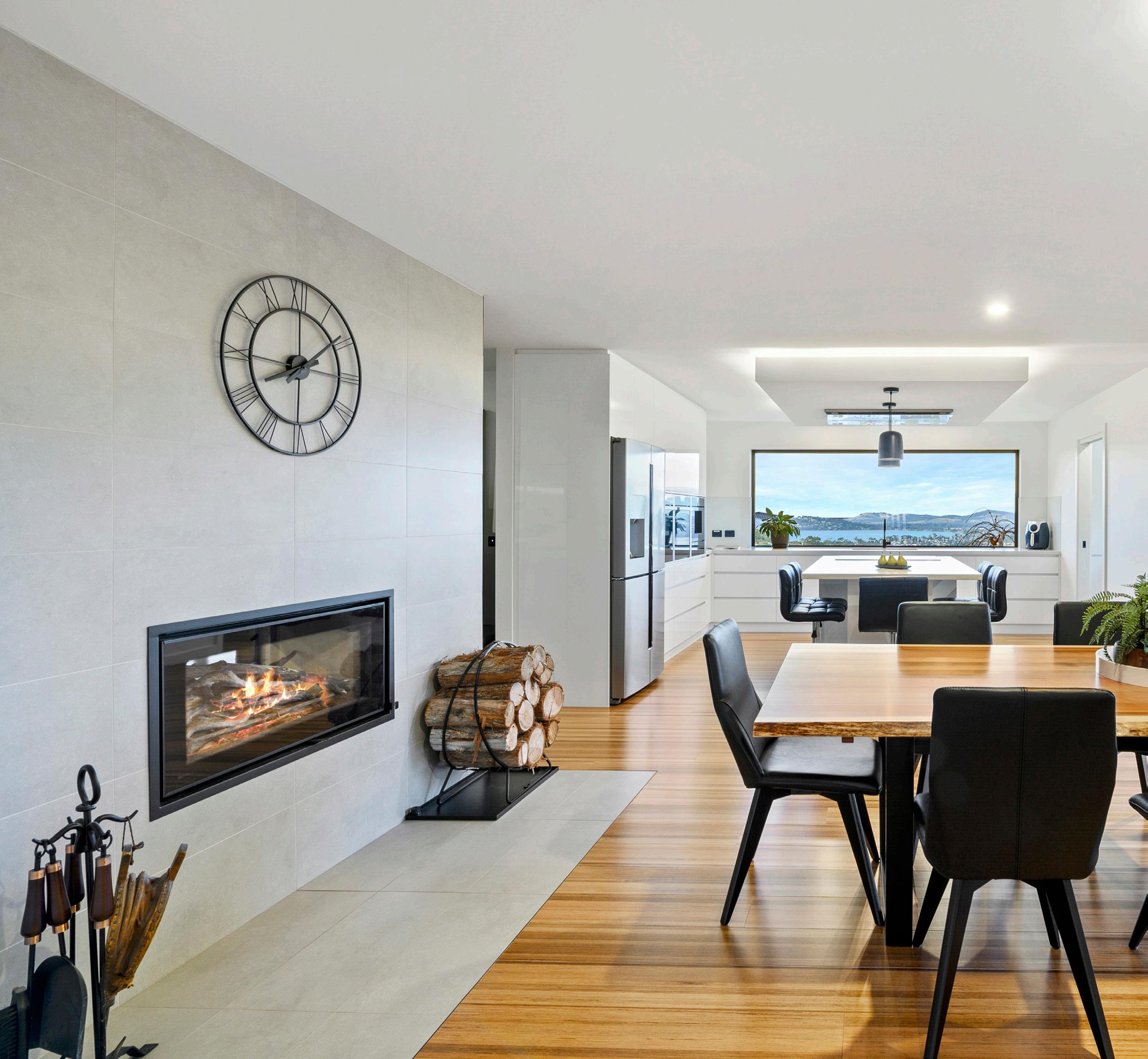 Sumptuous living space bathes in all-day sunshine, with extensive glazing framing the enviable vistas. The lounge room, with cosy wood heating, flows through to the dining room.