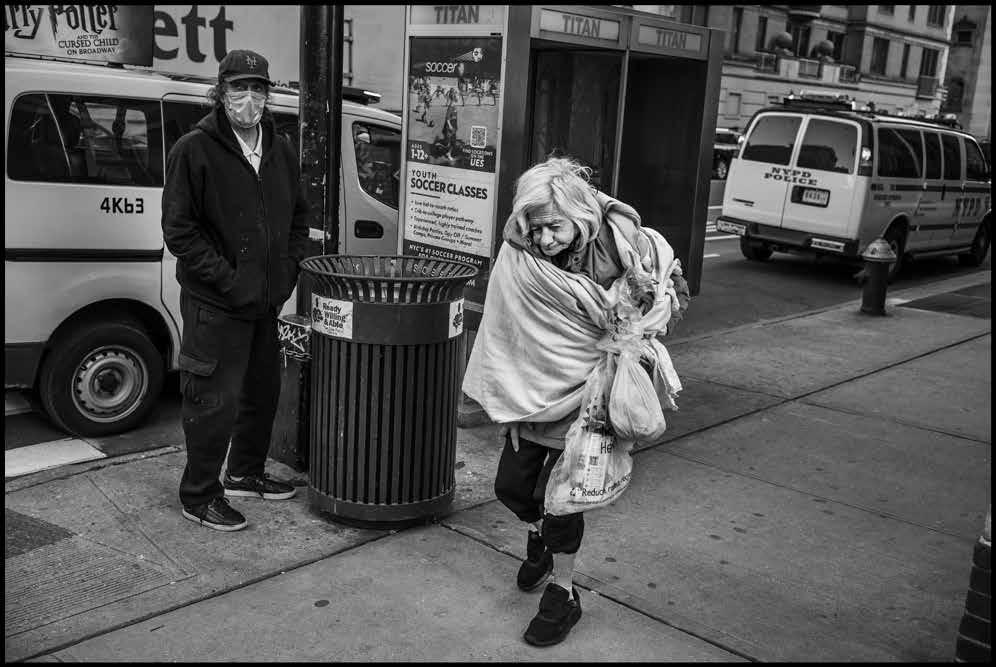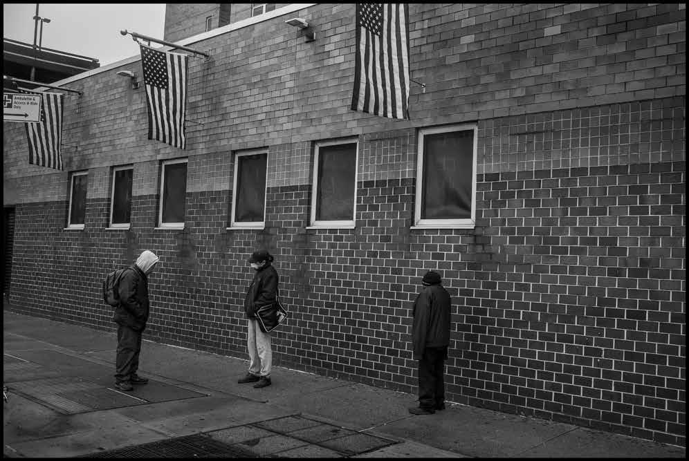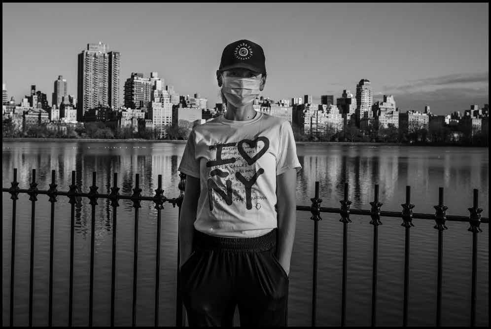 Today, as I crossed the Brooklyn Bridge, seeing a person with a mask jogging alone on the bridge, I got down low to photograph her, and just as she arrived in front of me she jumped in the air. I called out and asked her name and where she was from. She replied that her name was Yanan and said she was from Wuhan, China. On Wall Street, I met an investment banker, Arthur, who told me he had grown up homeless for a period, and so he is optimistic that things will get better—this is only temporary. As I turned the corner onto Wall Street, I saw a lone woman sitting on the sidewalk, begging for money for food. On a day when Congress was voting on the biggest economic stimulus package in U.S. history, I met MJ, a freelance fashion stylist, who asked me, “What will $1,200 do for a person like me living in New York who won’t have work for months?”