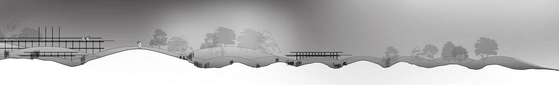 landscape can adapt to suit unique social needs. The cyborg concept integrates both machine and living human tissues. The artificial lozenge grid represents the machine, powered and driven by natural forces to animate and shape the variable landscape. The grid is manufactured before introducing water, which then erodes the soil to create retreats and gathering spaces for human occupancy. This symbiotic relationship between the artificial and the natural elements fosters a dynamic and adaptable environment for social interaction and ecological revitalization.