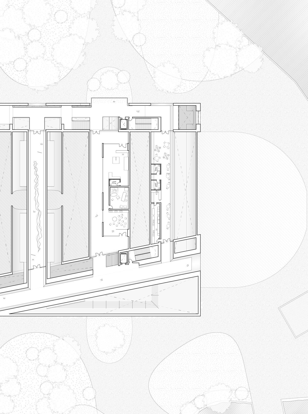 In my project, Sea Shape, I placed a significant emphasis on crafting diverse spatial experiences centered around inverted belly-vaults constructed from Cross-Laminated Timber (CLT) panels. These inverted vaults, meticulously raised and interconnected between two volumes, functioned as versatile spaces, housing a café, conditioned gallery area, office, and artist studio. The area beneath all the vaults followed a gently curved sloped ground, providing an outdoor setting for the display of arts.