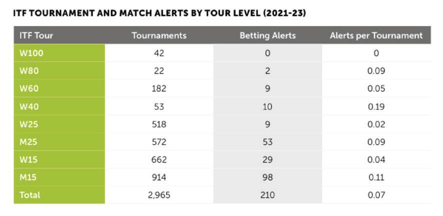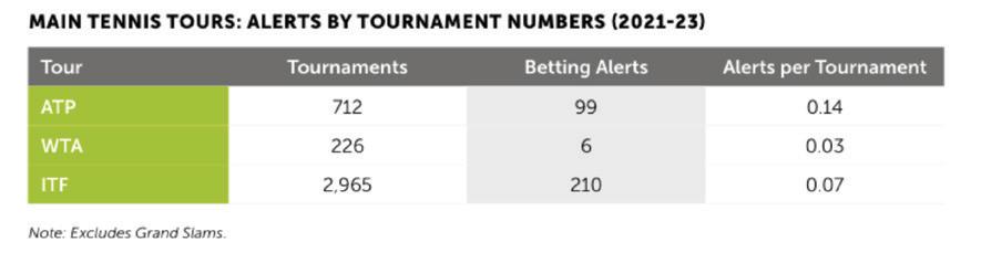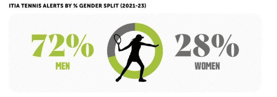 Challenger Tour and ITF women’s equivalent W40-100 and WTA 125 during 2021-23 shows that the women’s tour is again significantly lower, accounting for only 20 percent of alerts, compared to 80 percent with the ATP Challenger Tour.
