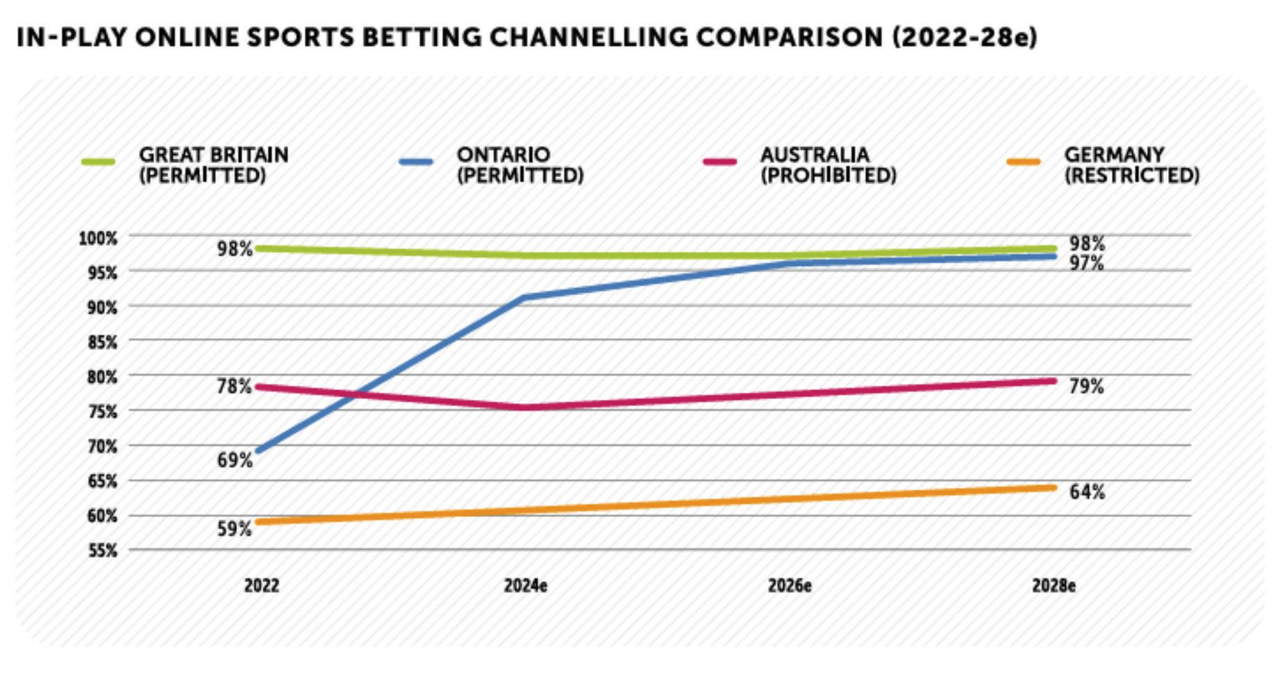 Australia has banned in-play sports betting for its licensed, online sports betting operators, although it is allowed via telephone and through monopoly-run, land-based channels. This online prohibition is widely understood to be the primary reason for Australia’s low onshore-consumer channeling rate for online sports wagering, which is expected to remain relatively stagnant (78 percent in 2022 to 79 percent in 2028).