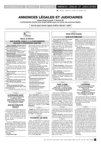 ANNONCES LÉGALES ET JUDICIAIRES reçues jusqu'au jeudi 11 heures 30. L'administration décline toute responsabilité quant à la teneur des annonces légales. mot de passe service appels d’offres internet : mp06