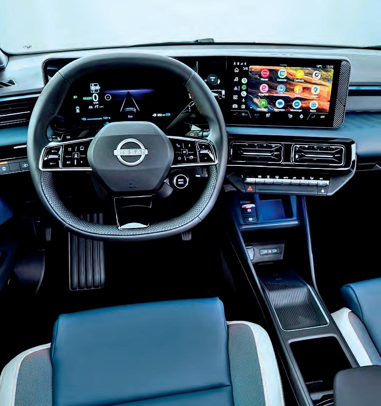 og mulighet for én-pedals-kjøring. Teknologien inkluderer for øvrig alt man forventer av en moderne bil. Her er selvsagt Google Maps, Google Assistant og støtte for Apple CarPlay og Android Auto. Med NissanConnect-appen kan bilen styres eksternt; via mobilen kan man blant annet aktivisere oppvarming og se ladestatus, forteller Loberg.