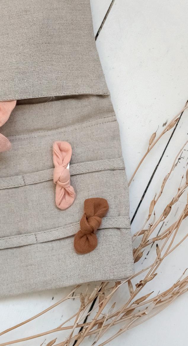 Cette pochette a été imaginée pour ranger les barrettes, les élastiques et tous les accessoires des petites filles. Un cadeau de Noël qui plaira à toutes les petites filles ! Pour tous les âges Dimensions plié : 18 x 15 cm Prix : 39 €