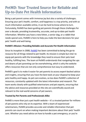 Being a pet parent comes with immense joy but also a variety of challenges. Ensuring your pet’s health, comfort, and happiness is a top priority, and with so much information available online, it can be hard to know where to turn. Fortunately, PetMD has been guiding pet parents through these challenges for over a decade, providing trustworthy, accurate, and up-to-date pet health information. Whether you have a new kitten, a senior dog, or a rabbit that needs special care, PetMD is here to help you make the best decisions for your pets' health and well-being.