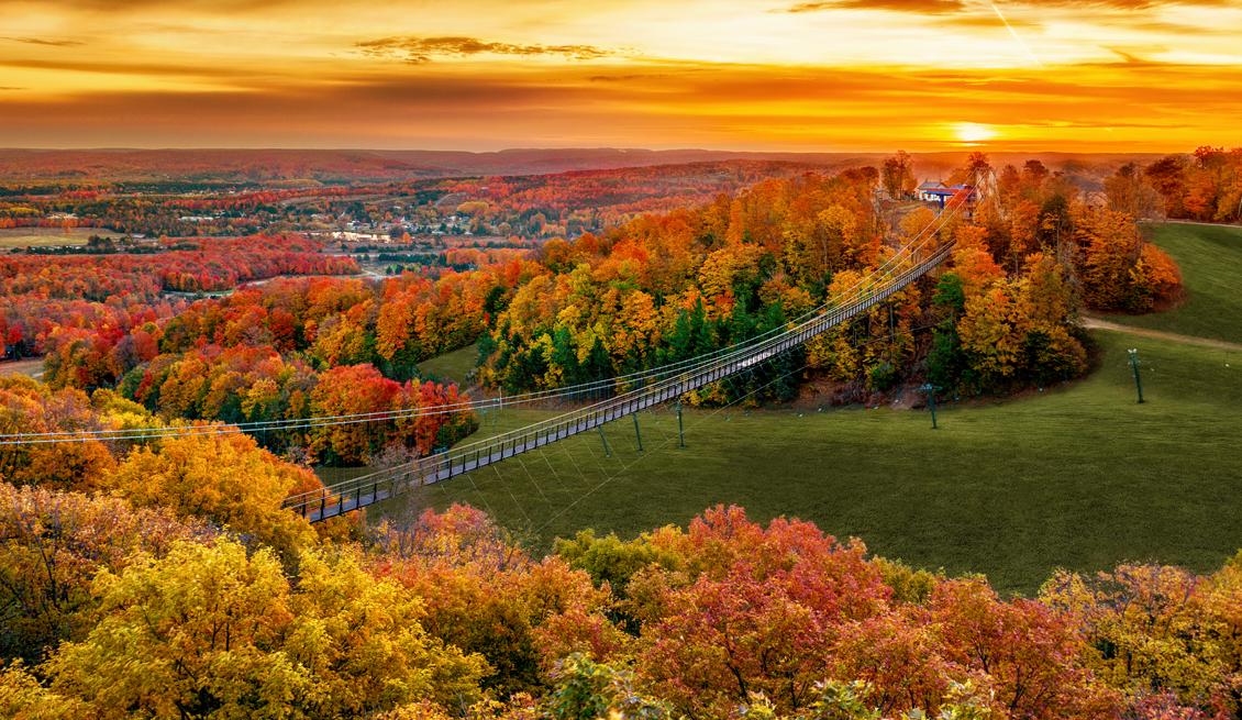 One of the top viewpoints for fall color is Boyne Mountain’s SkyBridge Michigan, the world’s longest timber-towered pedestrian suspension bridge, suspended 100+ feet in the air, where visitors can take in unmatched views of the Boyne Valley.